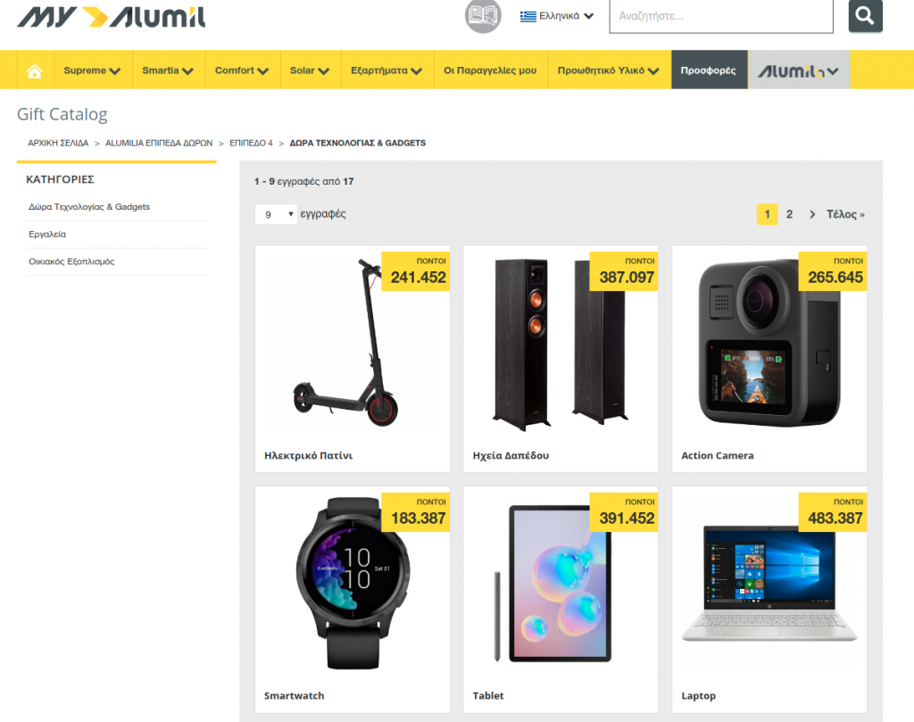 The members of the Alumilia Loyalty System, have the opportunity to redeem their points, winning rich gifts belonging to 4 different levels and 3 different commercial categories (Gadgets – Tools – Home Appliances).