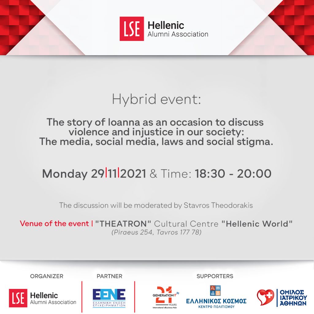 Leaving its own social footprint, Generation Y actively supports actions that aim to inform and raise public awareness against violence and injustice. That is why Generation Y stands as a Supporter in the alumni event of the London School of Economics on Monday 29/11 at the Cultural Center “Hellenic World”, where an enlightening discussion regarding violence and injustice in our society will be taking place: mass media, social media, law, and social stigma. The discussion will be moderated by Stavros Theodorakis.